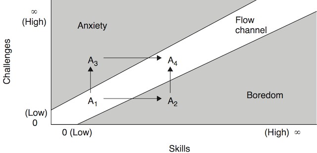 You can also lose your opportunity for Flow if you are bored. If you are bored because you don't have enough challenge for your skillset (A2), you have to increase your challenge (A4) to work your way back to flow. You enjoy things most when you are just on the edge of what you are capable of.